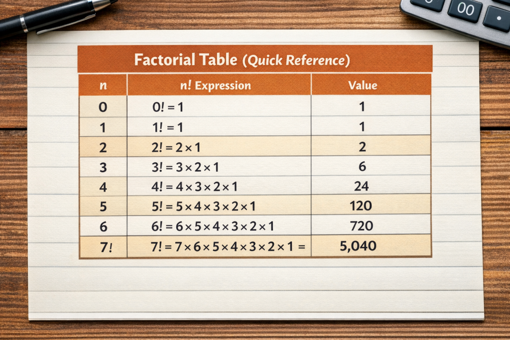 | 5 | 5! = 5 × 4 × 3 × 2 × 1 | 120 |