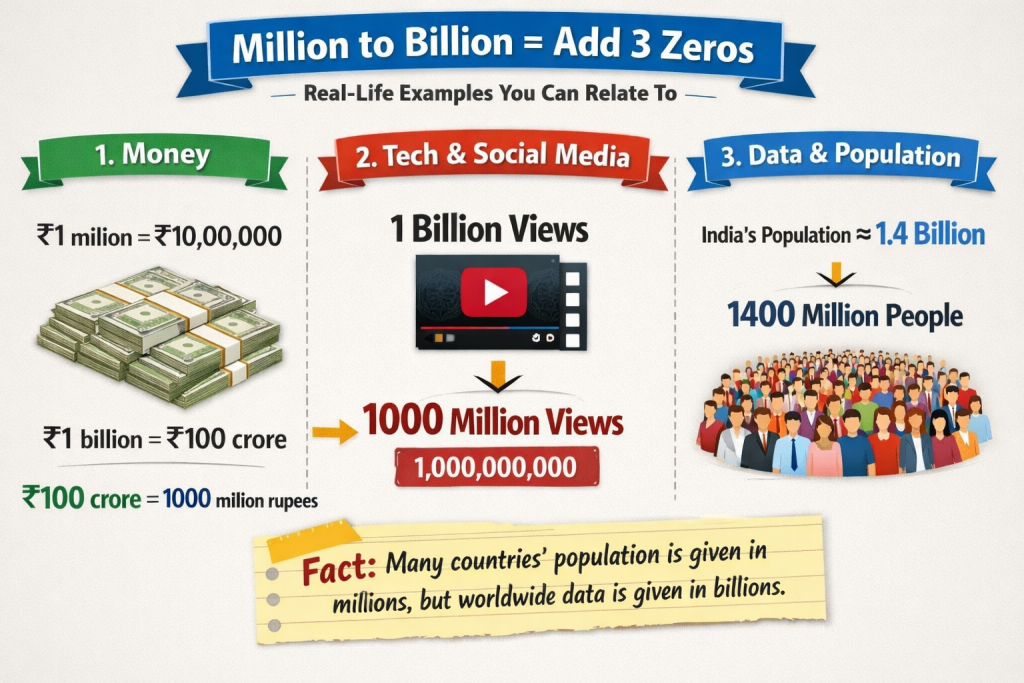 👉 “Million to Billion = add 3 zeros”